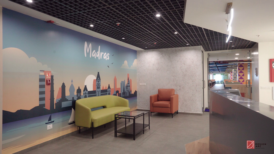 The workstation area is characterized by a bold use of orange accents, complemented by neutral tones. This energizing color scheme stimulates creativity and fosters a positive atmosphere, encouraging productivity throughout the day.